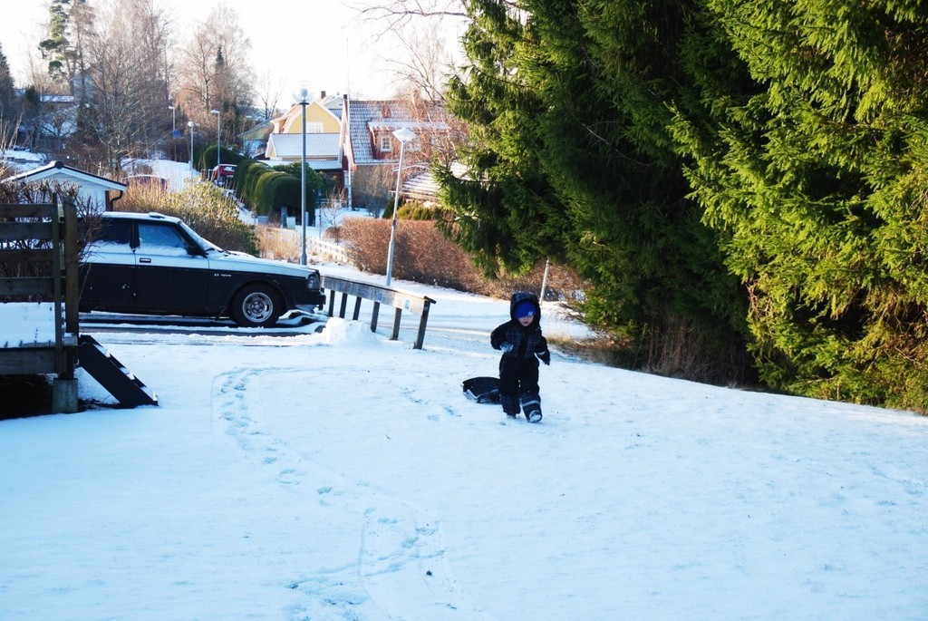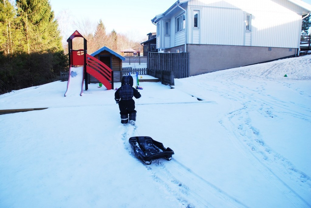 Vaknade upp och tittade ut och kände att idag går vi ut och åker lite pulka trots Kevin´s hosta! Var ute och åkte lite pulka och sitter nu i soffan men en varsin kopp te! Bara älskar sådana här mysiga dagar!